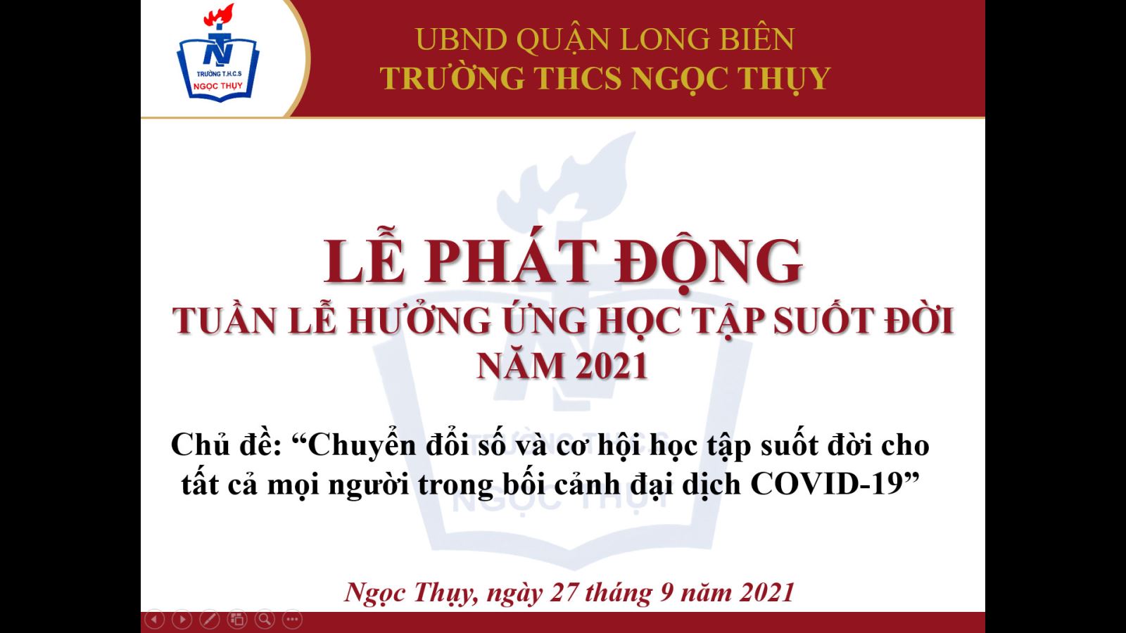 Thực hiện công văn số số 01/KH-BCĐ ngày 17/9/2021 của Ban chỉ đạo xây dựng xã hội học tập quận Long Biên về việc Tổ chức “Tuần lễ hưởng ứng học tập suốt đời” năm 2021, hôm nay ngày 27/9/2021, trường THCS Ngọc Thụy tổ chức lễ phát động “Tuần lễ hưởng ứng học tập suốt đời” năm 2021 với chủ đề: “Chuyển đổi số và cơ hội học tập suốt đời cho tất cả mọi người trong bối cảnh đại dịch COVID-19”.