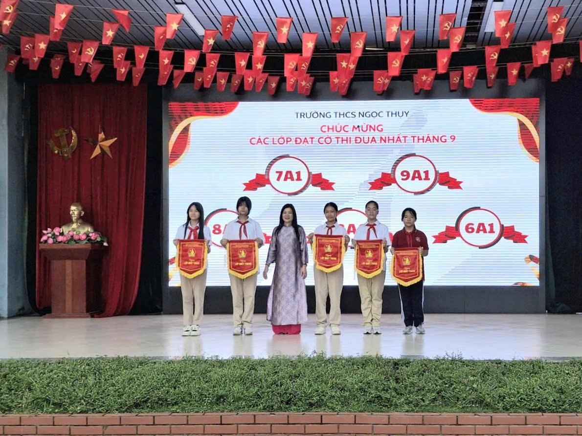 Mở đầu, Ban thi đua nhà trường trao cờ Nhất tháng cho các lớp xuất sắc: 7A1, 9A4, 8A1, 8A8 và 6A1 – ghi nhận nỗ lực, tinh thần trách nhiệm và phong trào học tập sôi nổi của các tập thể.