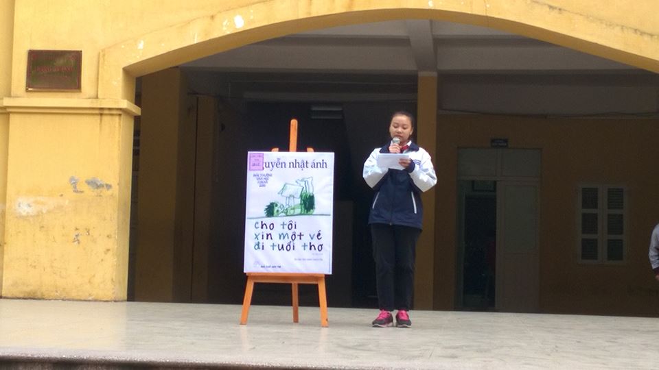 Hôm nay ngày 13/2/2017 vào giờ chào cờ, Thư viện nhà trường đã tổ chức giới thiệu sách với chủ điểm của tháng 2 “Tuyên truyền luật giáo dục và chăm sóc trẻ em”. Thư viện đã lựa chọn giới thiệu 1 cuốn sách mà bạn đọc rất yêu mến đó là cuốn “Cho tôi xin một vé đi tuổi thơ” của tác giả Nguyễn Nhật Ánh. Cuốn sách do Nhà xuất bản trẻ ấn hành năm 2015 gồm 12 chương và là cuốn sách vinh dự đại diện cho Việt Nam tham dự giải thưởng Văn học Asean lần thứ 11 năm 2010. Với lời giới thiệu hấp dẫn, truyền cảm bạn học sinh Hoàng Lê Minh Châu lớp 6A1 đã đánh thức tuổi thơ của mỗi thầy cô và học sinh trong nhà trường.