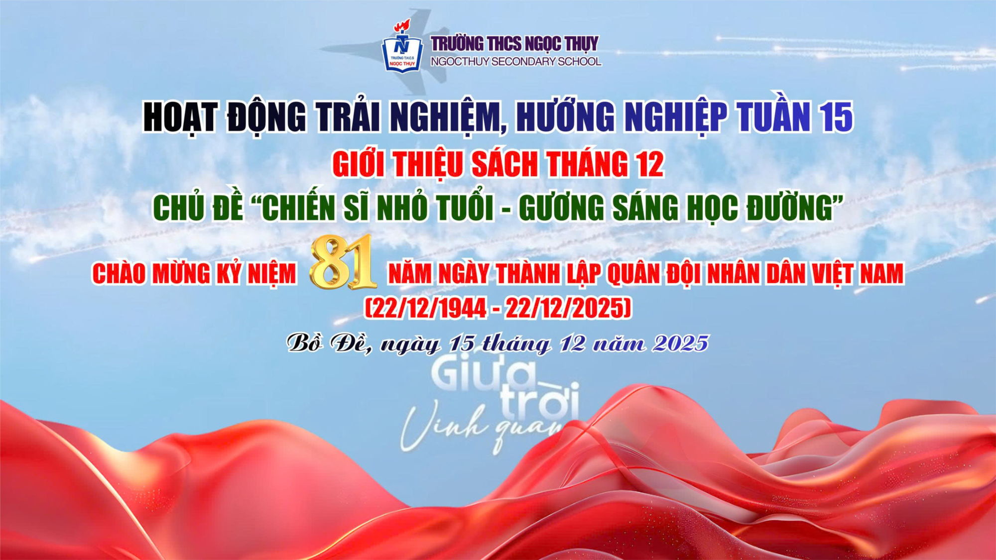 Sáng ngày 15/12/2025, trong không khí thi đua sôi nổi chào mừng 81 năm Ngày thành lập Quân đội Nhân dân Việt Nam (22/12/1944 – 22/12/2025), Trường THCS Ngọc Thụy đã tổ chức Hoạt động trải nghiệm, hướng nghiệp tuần 15 với nội dung Giới thiệu sách tháng 12, chủ đề “Chiến sĩ nhỏ tuổi – Gương sáng học đường”. Đây là hoạt động ý nghĩa nhằm giáo dục truyền thống cách mạng, bồi dưỡng lý tưởng sống, khơi dậy niềm tự hào dân tộc và lan tỏa văn hóa đọc trong học sinh toàn trường.