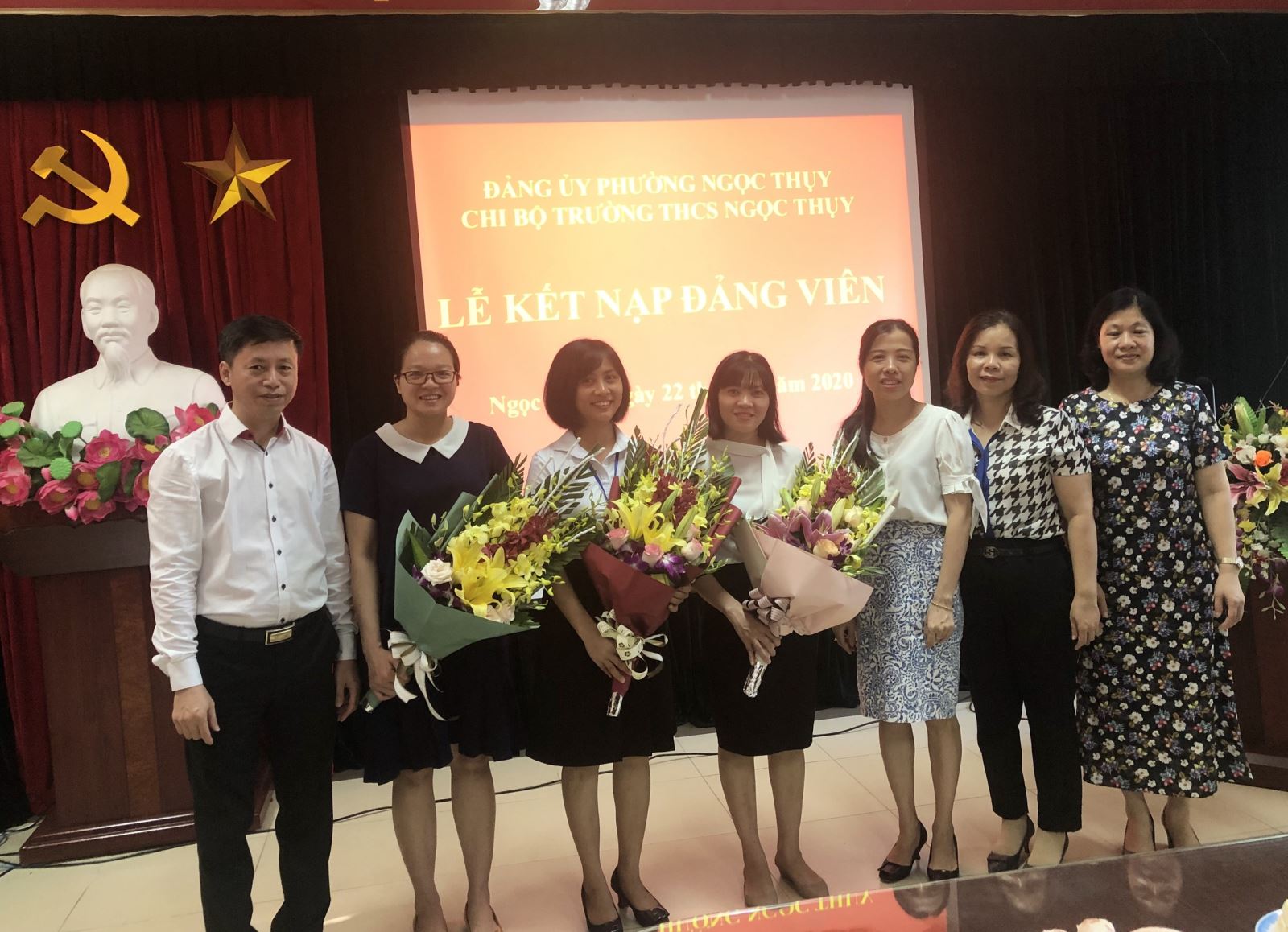 Hàng năm công tác phát triển Đảng ở Chi bộ Trường THCS Ngọc Thụy là nhiệm vụ thường xuyên có ý nghĩa quan trọng trong công tác xây dựng Đảng, góp phần xây dựng tổ chức cơ sở đảng vững mạnh. Được sự đồng ý của Đảng ủy phường Ngọc Thụy, lúc 07h30 ngày 22/07/2020, Chi bộ trường đã tổ chức kết nạp Đảng đối với 03 quần chúng ưu tú Dương Thị Thanh Huyền, Nguyễn Thị Tơ, Đoàn Thị Yên.
