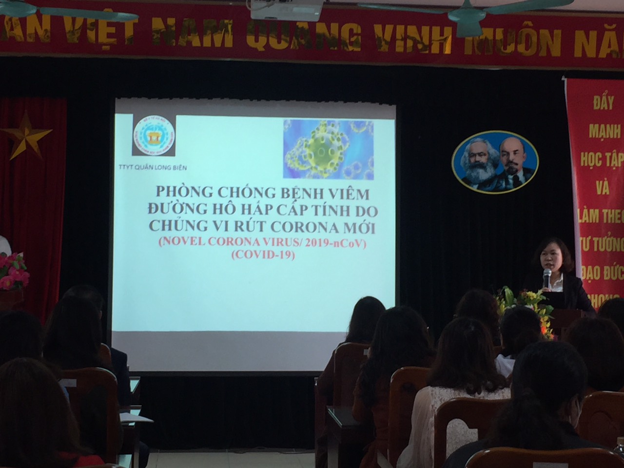 Thực hiện chỉ thị 05/CT-TTg ngày 28/01/2020 của Thủ tướng Chính phủ về việc phòng chống dịch viêm đường hô hấp cấp do chủng mới của virut Corona; căn cứ kế hoạch số 56/KH-UBND ngày 30/01/2020 của UBND quận Long Biên, 8h30 sáng nay 25/02/2020, toàn thể CBGV-NV trường THCS Ngọc Thụy đã tham dự buổi tập huấn phòng chống dịch bệnh CoVid19. Tại buổi tập huấn, Thạc sĩ Nguyễn Thị Chinh – Phó trưởng khoa y tế công cộng trung tâm y tế quận Long Biên đã giới thiệu những thông tin cơ bản về virut Corona như nguồn gốc tên gọi của virut, cơ chế lây nhiễm bệnh CoVid19, biểu hiện lâm sàng, cách phòng chống dịch bệnh… và cập nhật những số liệu mới nhất liên quan đến tình hình dịch bệnh ở Việt Nam và các nước trên Thế giới. Ngoài ra, các cán bộ trung tâm y tế quận và trạm y tế phường Ngọc Thụy còn hướng dẫn cho CBGV-NV nhà trường quy trình rửa tay sáu bước, cách đo thân nhiệt bằng nhiệt kế điện tử; đeo khẩu trang đúng cách và cách pha dung dịch khử khuẩn CloraminB để vệ sinh khử khuẩn đúng yêu cầu, chuẩn bị tốt công tác đón học sinh trở lại trường học.