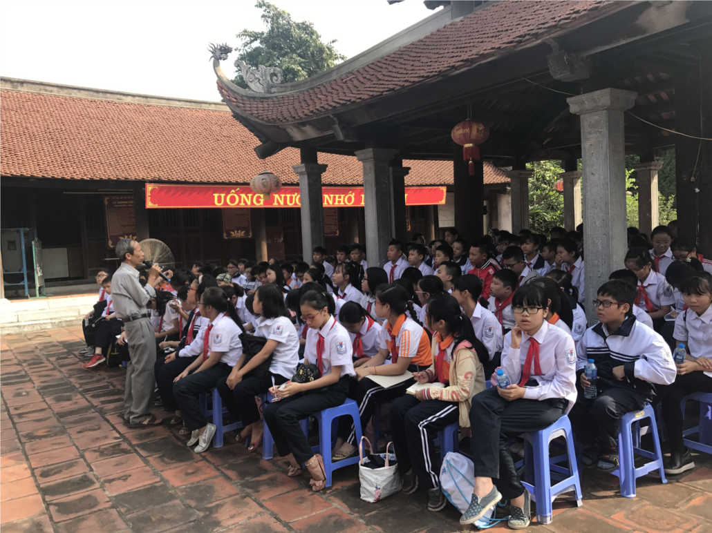 Các em học sinh ngồi nghe giới thiệu về lịch sử Đình Phúc Xá