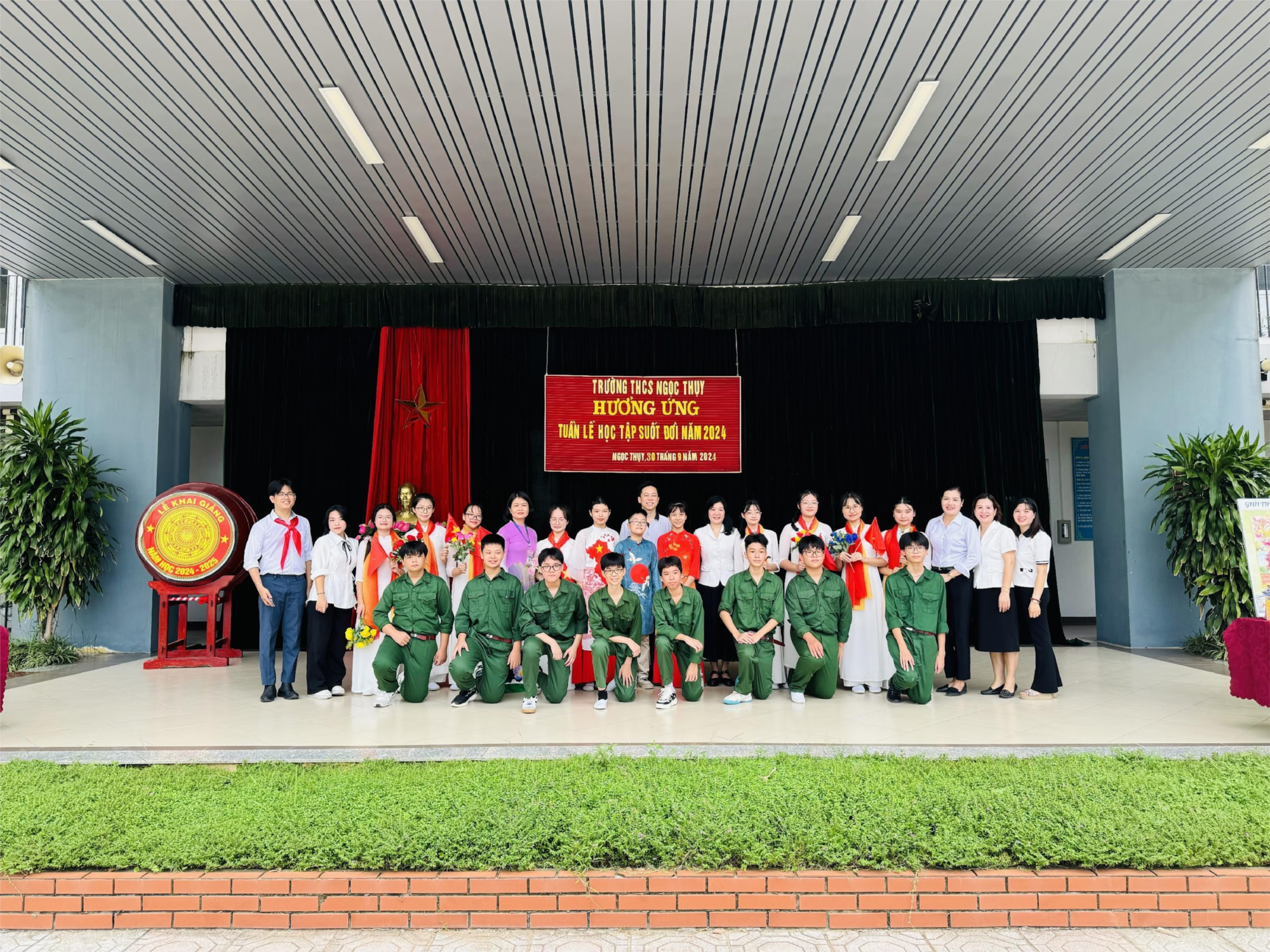 Hòa chung trong không khí cả nước chào mừng 70 năm ngày giải phóng Thủ đô (10/10/1954 – 10/10/2024), thực hiện Kế hoạch số 01/KH-BCĐ ngày 24/9/2024 của Ban Chỉ đạo xây dựng XHHT UBND Quận Long Biên về việc tổ chức “Tuần lễ hưởng ứng học tập suốt đời” năm 2024, giờ Chào cờ sáng nay, thứ Hai ngày 30/9/2024, trường THCS Ngọc Thụy đã long trọng tổ chức khai mạc Tuần lễ hưởng ứng học tập suốt đời năm 2024 với chủ đề: “Phát triển văn hóa đọc thúc đẩy học tập suốt đời”. Tham dự buổi lễ có cô giáo Lê Thị Thu Hoa – Bí thư chi bộ, Hiệu trưởng nhà trường, các thầy cô trong BGH - BCH công đoàn trường, tập thể giáo viên nhân viên và hơn 1395 học sinh nhà trường.