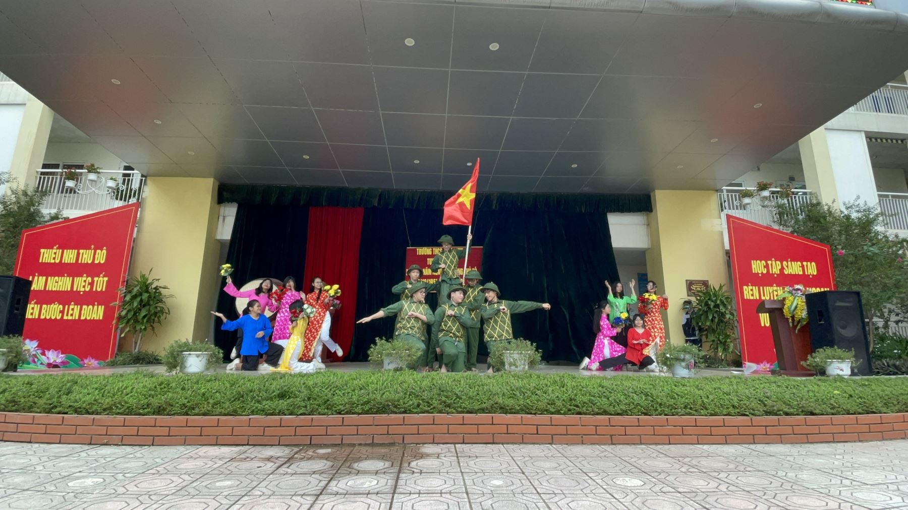 Mở đầu chương trình các con học sinh tham gia nghi lễ chào cờ trang trọng và ý nghĩa. Những cánh tay chào thẳng tắp như những búp măng xinh, giai điệu hào hùng của bài hát Quốc ca, đội ca vang lên đã nhóm lên trong mỗi bạn đội viên, nhi đồng lòng yêu nước và tự hào dân tộc. Chương trình đã để lại trong lòng mỗi học sinh những ấn tượng sâu sắc về lịch sử hào hùng của Thăng Long - Hà Nội đồng thời bồi đắp thêm lòng tự hào của thiếu nhi Thủ đô qua phần chủ điểm Hội vui học tốt.
