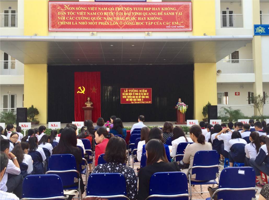 Sau lễ chào cờ, toàn thể CBGV-NV-HS nhà trường đã giành một phút tưởng niệm các nạn nhân tử vong do tai nạn giao thông. Đồng chí TPT đã đọc thông điệp hưởng ứng “Ngày Thế Giới tưởng niệm các nạn nhân tử vong do Tai nạn giao thông”.