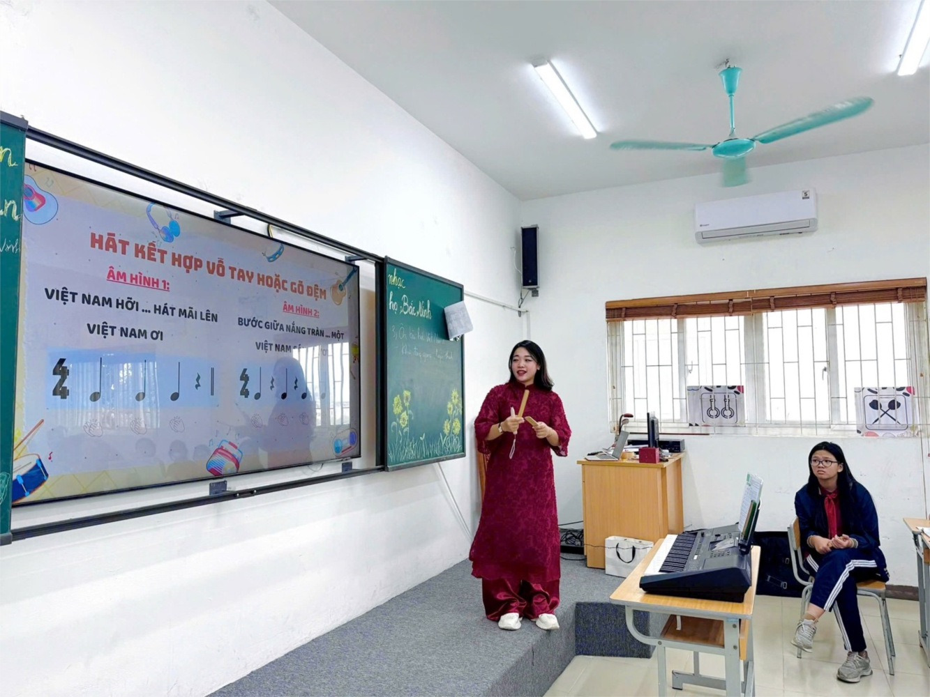 Trong tiết học, cô giáo Khổng Huyền Linh đã giới thiệu đến học sinh những nét đặc trưng của dân ca Quan họ như nguồn gốc, làn điệu, cách hát giao duyên và ý nghĩa trong đời sống văn hóa Kinh Bắc. Thông qua các hoạt động như nghe – hát thử làn điệu Quan họ, thảo luận nhóm và tìm hiểu ca từ các bài dân ca quen thuộc (Người ở đừng về, Se chỉ luồn kim...), học sinh được trải nghiệm, cảm nhận và thêm yêu mến âm nhạc dân gian Việt Nam.