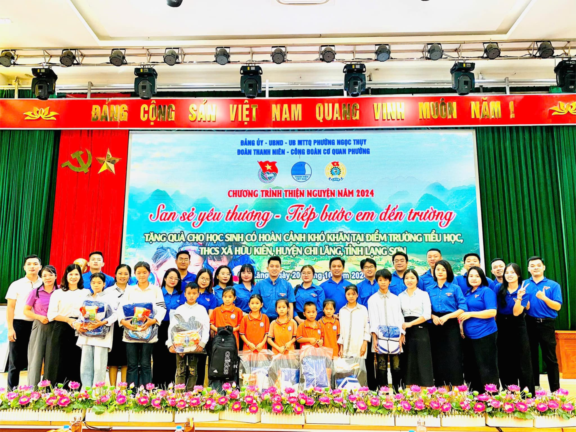 THCS Ngọc Thuỵ tham gia chương trình thiện nguyện “San sẻ yêu thương - Tiếp bước em đến trường” do Đảng uỷ - UBND - UBMTTQ - Đoàn Thanh niên và Công đoàn phường Ngọc Thuỵ tổ chức tại trường Tiểu học và THCS xã Hữu Kiên, huyện Chi Lăng, tỉnh Lạng Sơn.