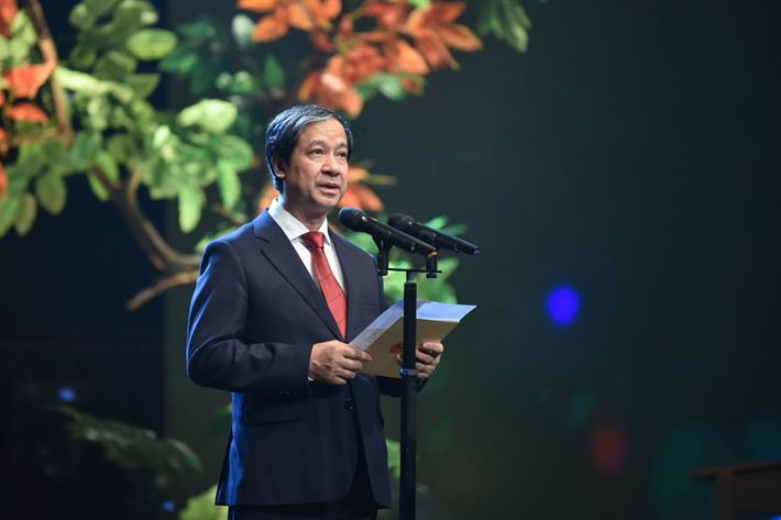 Hôm nay, nơi đây họp mặt những người, trong khó khăn thử thách của ngành giáo dục thời kỳ đổi mới, thời kỳ ứng phó và hạn chế các tác động tiêu cực của dịch bệnh Covid- 19, đã hoàn thành xuất sắc nhiệm vụ của mình. Các thầy cô là những người cần được tôn vinh xứng đáng. Tôi xin gửi tới các thầy cô tiêu biểu cho nhà giáo cả nước họp mặt ở đây hôm nay, lời ngợi ca, sự biểu dương, ghi nhận công lao và lời cảm ơn sâu sắc”, Bộ trưởng nói.