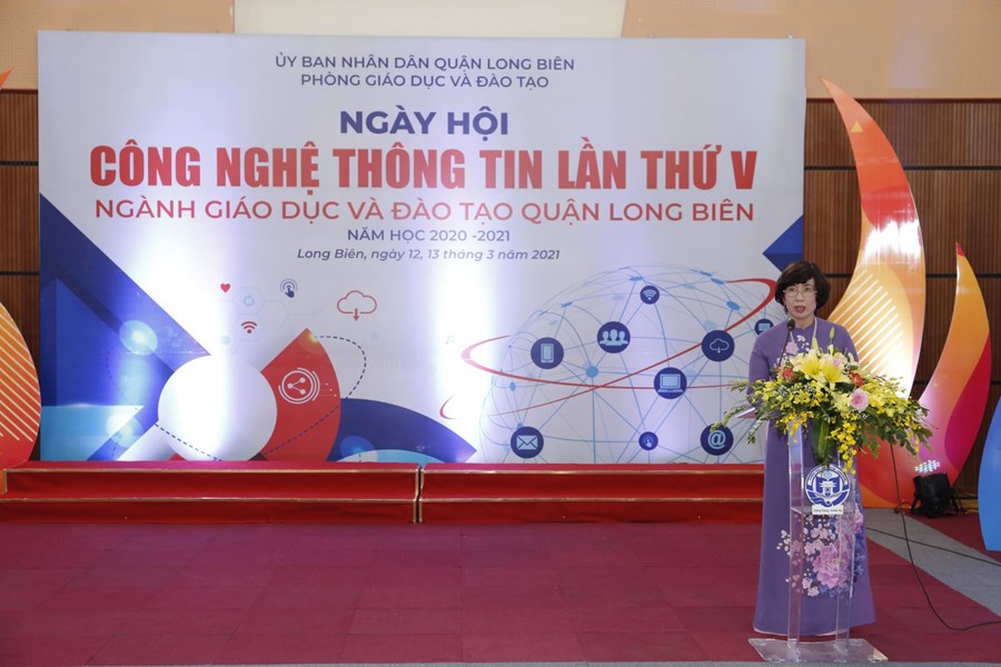 Phát biểu trong lễ khai mạc, đồng chí Vũ Thị Thu Hà - Trưởng phòng GD&ĐTQuận khẳng định: “Công nghệ thông tin đóng vai trò rất quan trọng đối với việc đổi mới và phát triển giáo dục. Việc ứng dụng CNTT đã được Bộ GD&ĐT xác định là 1 trong 9 nhiệm vụ trọng tâm của ngành GD&ĐT. Quận ủy, UBND Quận Long Biên đã quan tâm chỉ đạo quyết liệt hoạt động ứng dụng CNTT trong toàn Quận nói chung, đặc biệt đối với ngành GD&ĐT Quận. Việc ứng dụng công nghệ thông tin, xây dựng mô hình trường học điện tử, đào tạo đội ngũ là khâu đột phá trong đổi mới công tác quản lý, nâng cao chất lượng giáo dục. Hàng năm, Quận đã quan tâm đầu tư và nâng cấp thiết bị, đào tạo, bồi dưỡng nhân lực CNTT trong ngành, xây dựng các mô hình mới về trường học điện tử, do đó việc ứng dụng CNTT trong các hoạt động quản lí, dạy và học trong các nhà trường của Quận phát triển với tốc độ khá nhanh, đáp ứng yêu cầu đổi mới giáo dục theo tinh thần Nghị quyết 29-NQ/TW của Ban Chấp hành Trung ương”.